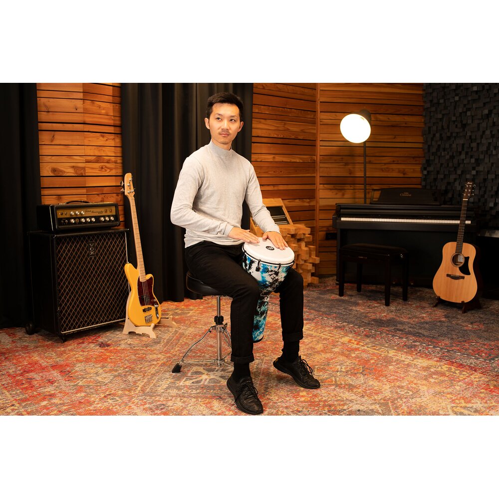 The djembe's ultra lightweight construction enhances its portability and playability. Crafted with advanced materials, it significantly reduces the drum's overall weight without compromising its durability or sound quality. This makes it an ideal choice for musicians on the go, allowing them to effortlessly carry and play the instrument for extended periods without fatigue, making it perfect for performances and travel.