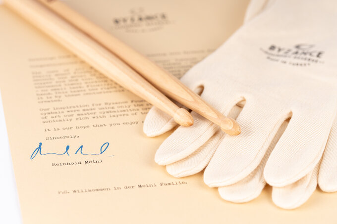 Each Byzance Foundry Reserve comes with a pair of Meinl Stick & Brush Standard 5A Drumsticks, a pair of 100% cotton handling gloves, a signed certificate of authenticity, and a personal letter from Mr. Reinhold Meinl.
