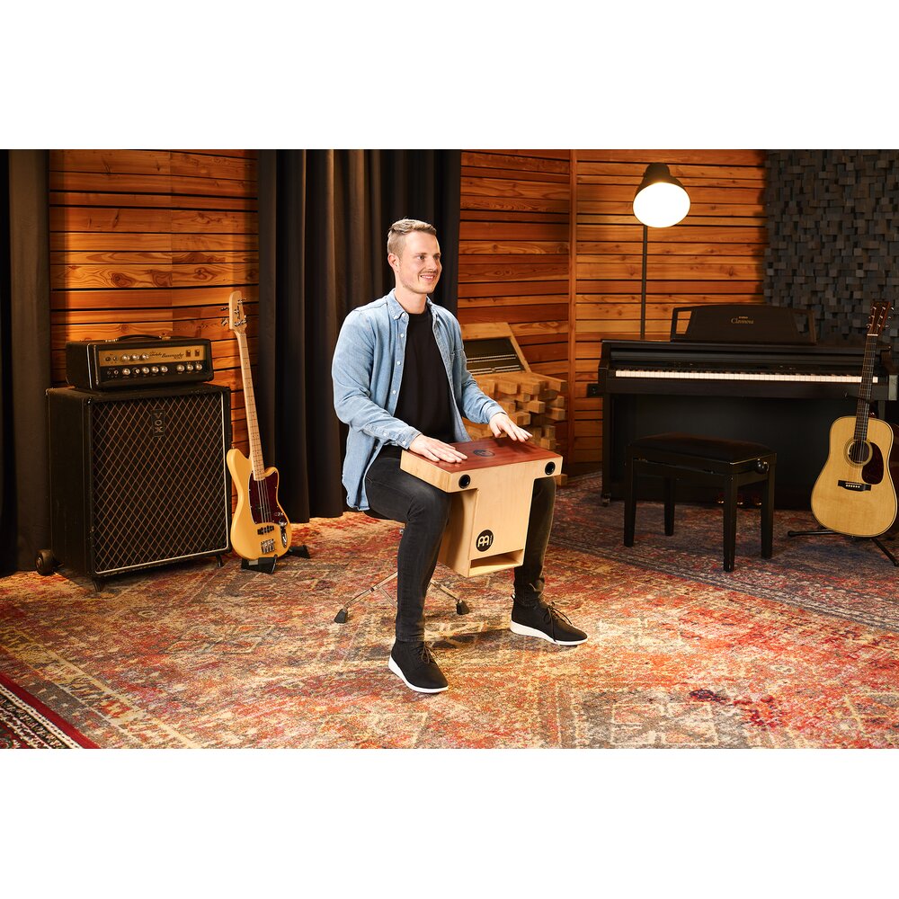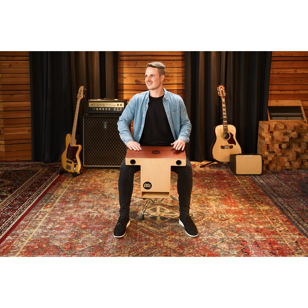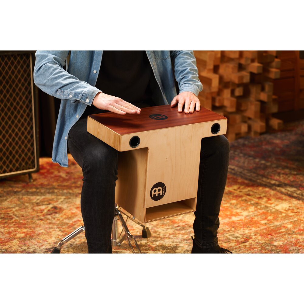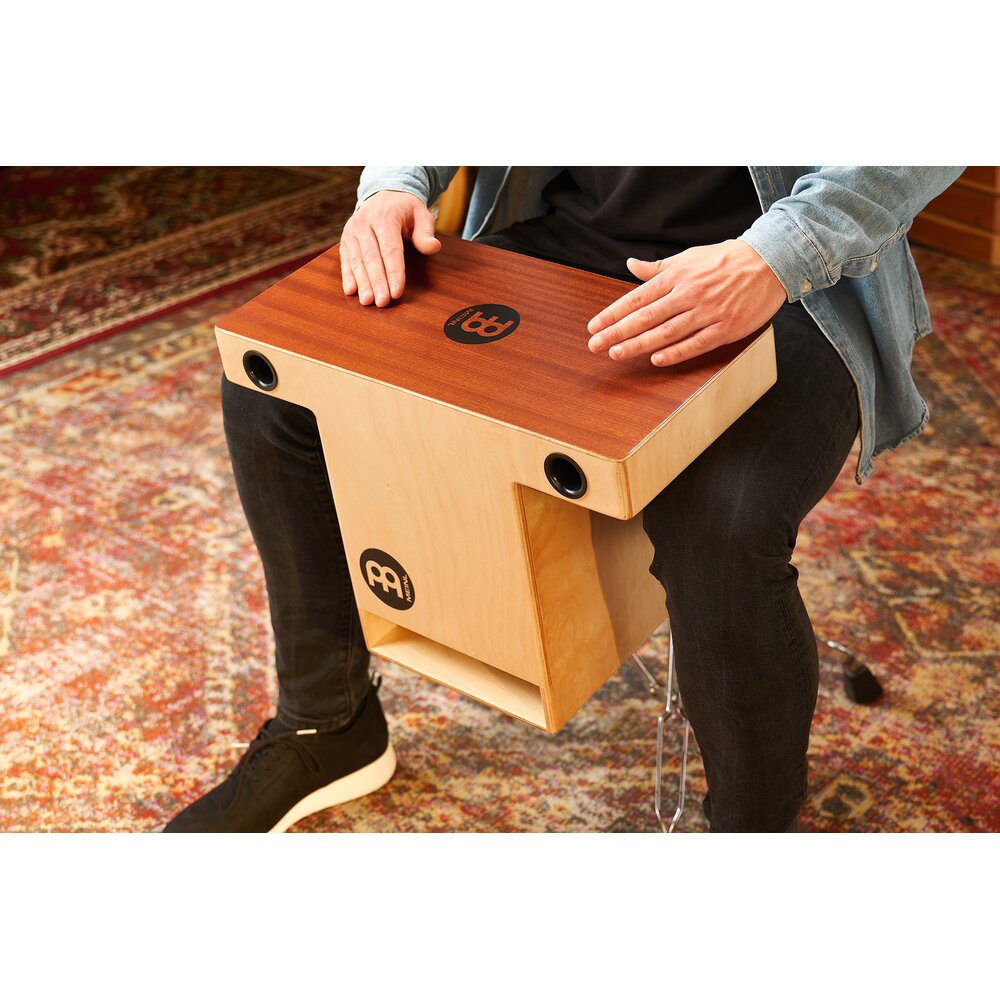 These models are designed to bring the striking surface up nearer to the player, for a more upright playing style. The sound projects forward into the audience! The Turbo Slap-Top Cajon is slightly bigger for more volume and it comes with snares on both sides. Here the snares also feature a forward sound projection.