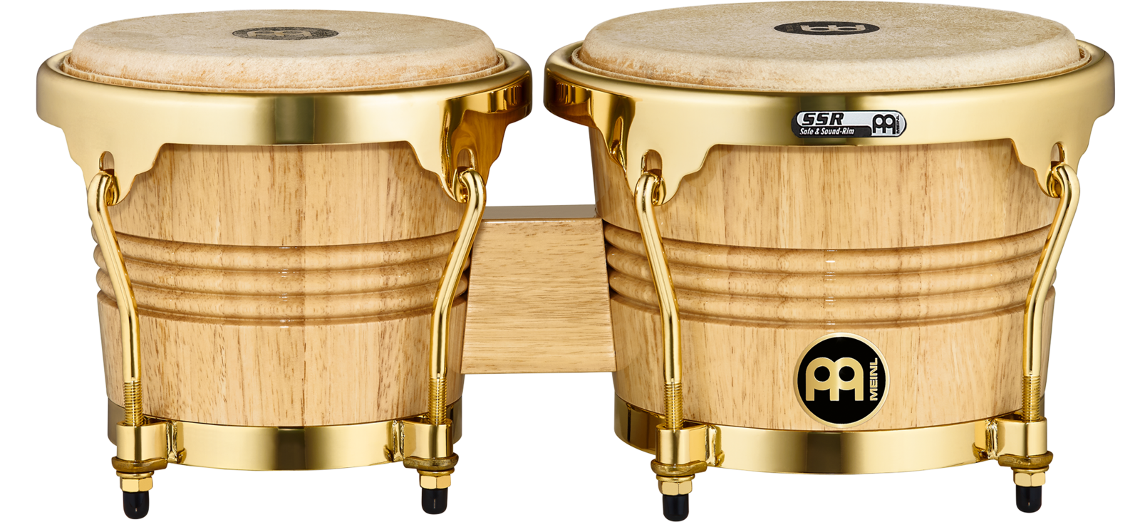 Meinl’s patented Free Ride Suspension System, which comes standard on our Marathon and Designer Series bongos, connects the Macho and Hembra without drilling any holes into the shells of the drums. This results in enhanced resonance, as the wood shells are uninhibited to vibrate freely. The Free Ride System is easy to spot; just look for the connection in the shape of a Meinl logo between the two drums. Meinl Marathon and Designer Series bongos come in a variety of finishes.
