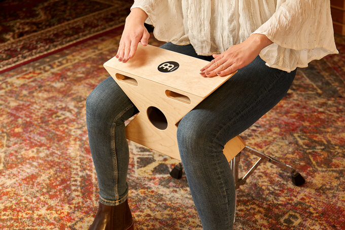 The Slaptop Cajons come with the characteristic T-shape, which allows the instrument to be placed on the lap while sitting. This keeps the back straight and the player sits comfortably upright.