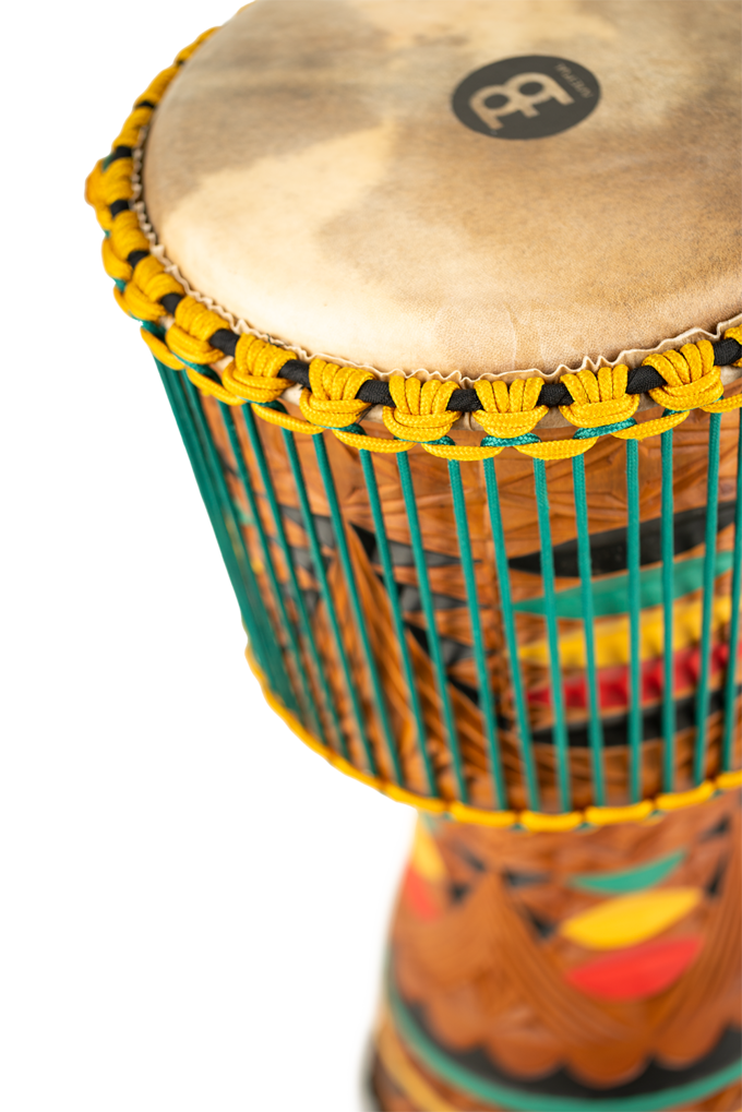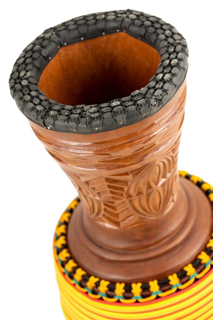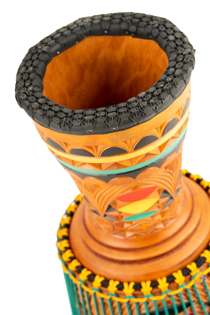 Artisan Edition Djembes and Tongo Carved Djembes draw attention through their astounding, labyrinthine-like carvings and eye-popping colors.