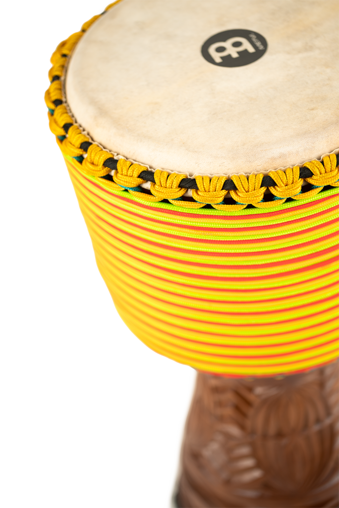 Meinl Professional African Style Djembes come in medium (10” x 20”) and large (12” x 24”) sizes. Each model is finished with a unique hand-carved element, and the shells are equipped with hand-selected goat skin heads.