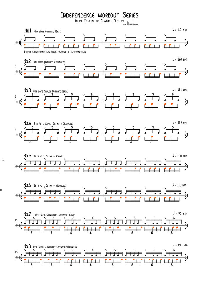 In eight mini workouts, four cowbells are featured with different subdivisions from easy (smallest cowbell) to advanced (largest cowbell). The workout series starts with basic 8th note patterns and ends with 16th notes quintuplets, based on a (1) systematic way -and a (2) musical way of learning.