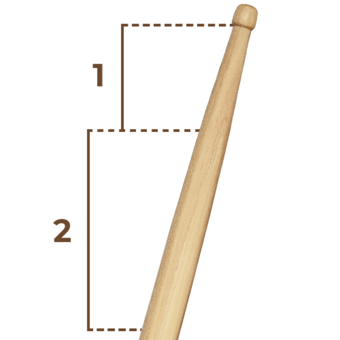 The first taper is long and gradual which gives the stick more natural rebound. The second taper is short and reaches the neck diameter quickly. This equips the player with more forward weight and a heavy feel when desired.